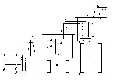 串級試驗變壓器的接線如下圖: