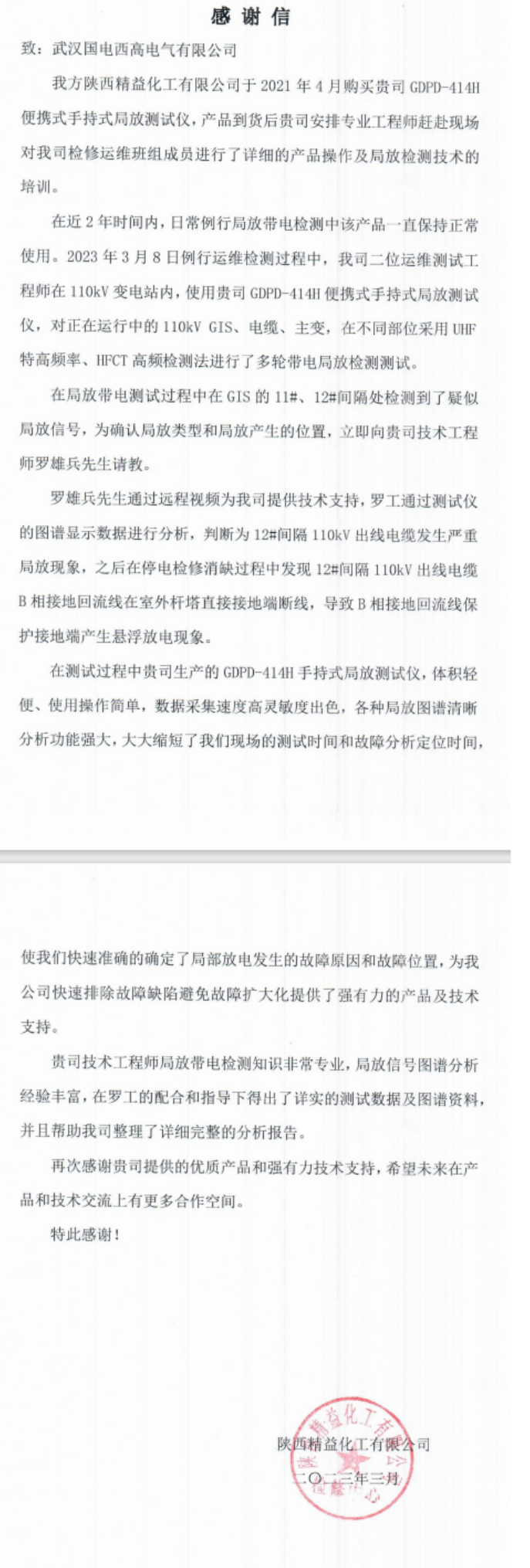 近期,國(guó)電西高收到一封來自陜西精益化工有限公司發(fā)來的感謝信。信中對(duì)雙方的合作進(jìn)行了高度評(píng)價(jià),對(duì)我司局放巡檢產(chǎn)品及技術(shù)工程師羅雄兵表示了肯定與贊揚(yáng)。
